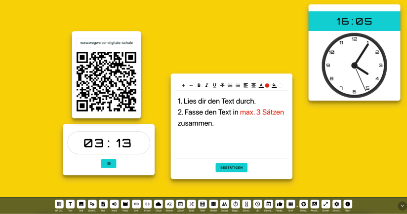 Konkret geht es darum, dass Sie auf Ihrer digitalen Tafel schnell Objekte wie einen Timer, eine Lernampel oder Arbeitsanweisungen einblenden können. Das kann auch Digiscreen und – wie ich finde – noch besser und mit noch mehr Funktionen als das andere Tool. Erfahren Sie in diesem Beitrag, wie Sie damit Ihren Unterricht besser strukturieren können. Das ist Digiscreen Bei Digiscreen handelt es sich um eine interaktive Tafel, auf der Sie unterschiedliche Elemente einblenden können. Sie können diese im Unterricht oder auch in Distanz gut verwenden. Digiscreen ist ein kostenloses Open-Source-Projekt, das Sie in Deutschland gehostet unter digiscreen.elearningdienst.de erreichen können. Es ist keine Registrierung notwendig und läuft auf allen Endgeräten. Sehr praktisch: Dokumente einbinden und minimieren Was mir sehr gut gefällt, ist die Möglichkeit, dass Sie Dokumente (Formate .pdf, .odt, .odp, .ods) hochladen können. Wählen Sie hierzu einfach das Doc-Objekt in der Leiste aus. In Kombination mit dem Text-Objekt daneben können Sie somit beispielsweise ein PDF-Dokument öffnen und dann Stichpunkte daneben notieren. Sehr praktisch – und mit jedem Objekt möglich: Der Pfeil nach oben minimiert das Objekt auf die Größe eines kleinen schmalen Balkens. Das ist praktisch, wenn Sie bereits Objekte auf der Tafel hinterlegen, aber noch nicht zeigen möchten. Mein Tipp: Ein Doppelklick auf den Namen (hier beispielsweise „Dokument“) ermöglicht Ihnen ein eigenständiges Benennen. Ganz schnell: Lückentext einbinden Auch sehr hilfreich ist die Möglichkeit, einen Lückentext einzubinden. Wählen Sie dazu das Lücken-Objekt aus. Die Anwendung wird auch gleich erklärt: Alles, was Sie tun müssen, ist, Lücken mit Sternchen zu kennzeichnen, also beispielsweise: „Der Fingerhut ist eine *Pflanze*.“ Der Lückentext wird dann mit den entsprechenden Freistellen angezeigt, kann befüllt und dann auf Richtigkeit überprüft werden. Begriffe ordnen Das Ordnen-Objekt eignet sich dafür, dass Sie verschiedene Begriffe (z. B. Wochentage) in der richtigen Reihenfolge eingeben. Diese werden dann zufällig